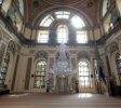 Camiinin içine baktığımızda kubbe içinin ve pandantiflerin yaldız ve yağlı boya kalem işleri ile Batı tarzında süslendiği, renkli mermer işçiliğinin geldiği son noktayı, mihrap ve minberde geleneksel tarzdan uzaklaşarak barok bezemelerin varlığı görülmektedir.